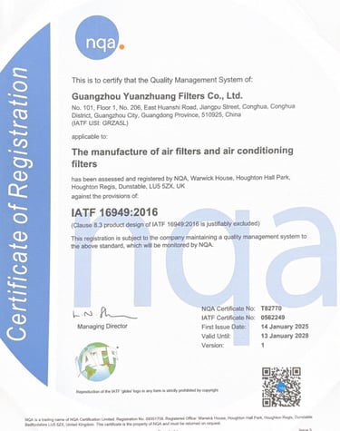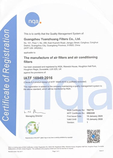 With 20 years of professional experience in the filtration industry, Guangzhou Yuanzhuang Filter Co., Ltd. holds the authoritative IATF 16949:2016 certification.
